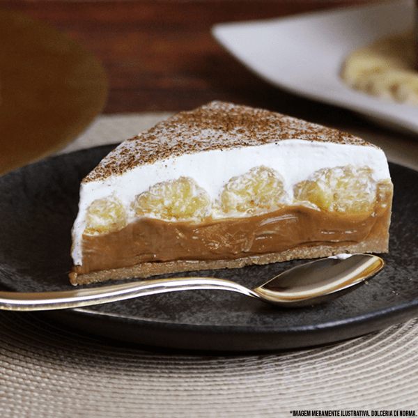 Massa de biscoito, recheada com doce de leite moça cozido e bananas frescas coberto com chantilly.