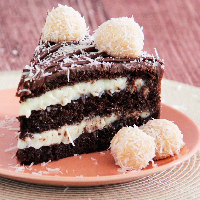 Deliciosa massa de chocolate recheado por mousse de chocolate e cocada cremosa. Sua decoração é feita com uma cobertura trufada de chocolate e beijinhos de coco!