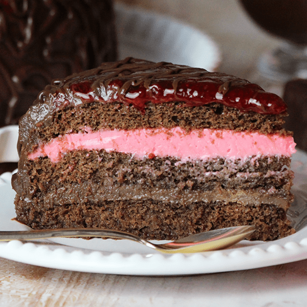 O Bolo Sensação é um bolo de chocolate recheado de creme de morangos. Cobertura de morangos em compota e creme de chocolate. *imagem meramente ilustrativa.