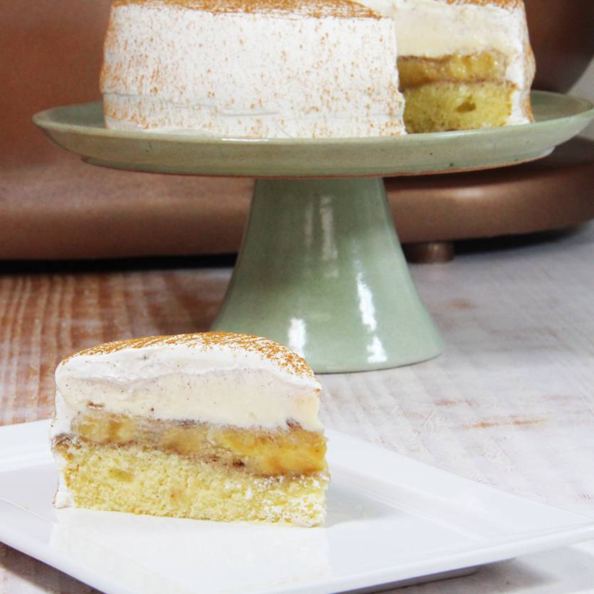 Surpreendente Pão de ló, recheado de delicioso creme flambado de banana com creme maravilha de leite condensado. Cobertura de chantilly e canela em pó.