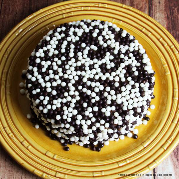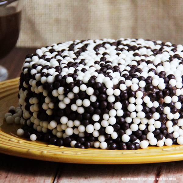 Pão de ló natural com duplo recheio de brigadeiro preto e branco. Cobertura de bolinhas de cereal de chocolate.